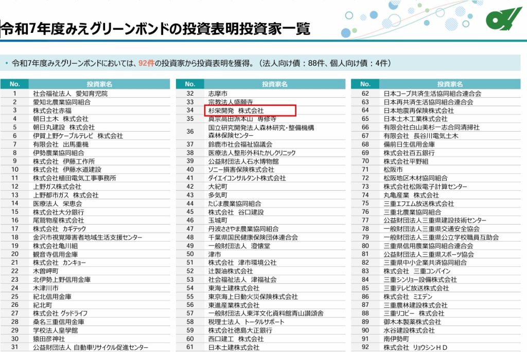 グリーンボンドとは出資資金の1つですが、三重県庁様が推進されるグリーンプロジェクト(環境保全、環境改善)に利用されます。